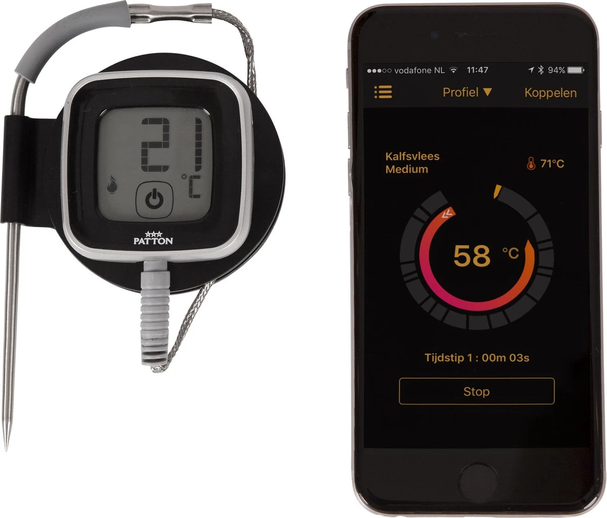 De Patton smart thermometer maakt middels Bluetooth contact met je smartphone of tablet. Download de gratis app uit de Appstore of Google Play Store en koppel deze aan je Patton Bluetooth Smart Thermometer, waarna je de temperatuur van je gerecht op afstand kunt volgen.